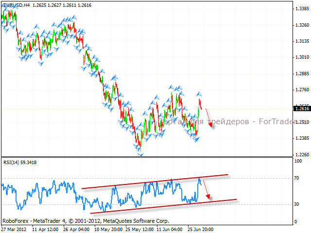 На четырехчасовом графике пары eur/usd, значения Индекса относительной силы встретил сопротивление в виде верхней границы восходящего канала. Как видим, здесь также есть потенциал для падения значений в область 30. Стоит ожидать начала развития нисходящего движения на евро с текущих уровней. Отменой станет пробитие уровня 1.2760.