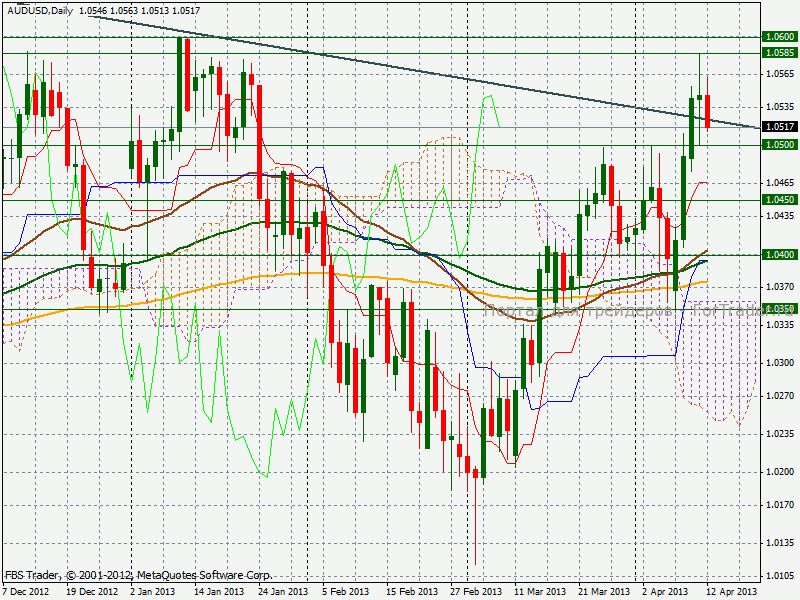 На прошедшей неделе пара AUD/USD подскочила на 240 пипсов, протестировав в четверг новый 10-недельный максимум на $1.0585. Таким образом, австралиец отскочил от дневного облака Ишимоку ($1.0390) и поднялся выше линии сопротивления 2011-1013 гг. ($1.0520). Однако преодолеть барьер в $1.0600 быки так и не смогли: в пятницу пара скорректировалась вниз.