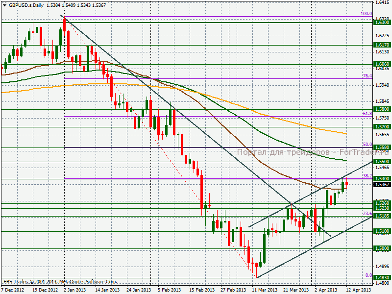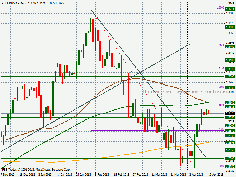 В первой половине недели пара EUR/USD медленно двигалась вверх. Основная борьба быков и медведей происходила в диапазоне между $1.3115 и $1.3150. Из данных быков порадовали хорошие значения по промышленному производству Германии, Франции и еврозоны. Протокол заседания ФРС оказался достаточно ястребиным, но после выхода в США слабых данных по занятости инвесторы уже не ждут, что американский Центробанк начнет сворачивать программу по выкупу облигаций. Розничные продажи, опубликованные в пятницу, сократились в марте на 0.4% после февральского подъема на 1%.