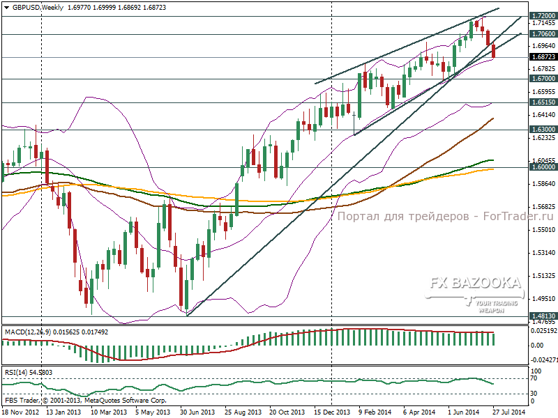 После июньского восхождения в июле подъем GBP/USD сначала приостановился, и пара проторговалась до середины месяца в районе $1.7160/$1.7060, а потом после образования пика на $1.7190 развернулась вниз, планомерно разрушая уровни и линии поддержки. В итоге фунт упал ниже $1.6900, почти достигнув средней недельной полосы Боллинджера ($1.6860). На недельном графике последние максимумы не подтверждены индикатором MACD. Закрепление ниже этого уровня вызовет снижение стерлинга к $1.6720/00 и $1.6515 (нижняя недельная полоса Боллинджера). Сопротивление расположено на $1.6996 (майский максимум), $1.7060 и $1.7160. Картина останется медвежьей ниже $1.7200 – для пробоя этого уровня быкам понадобится мощный стимул.