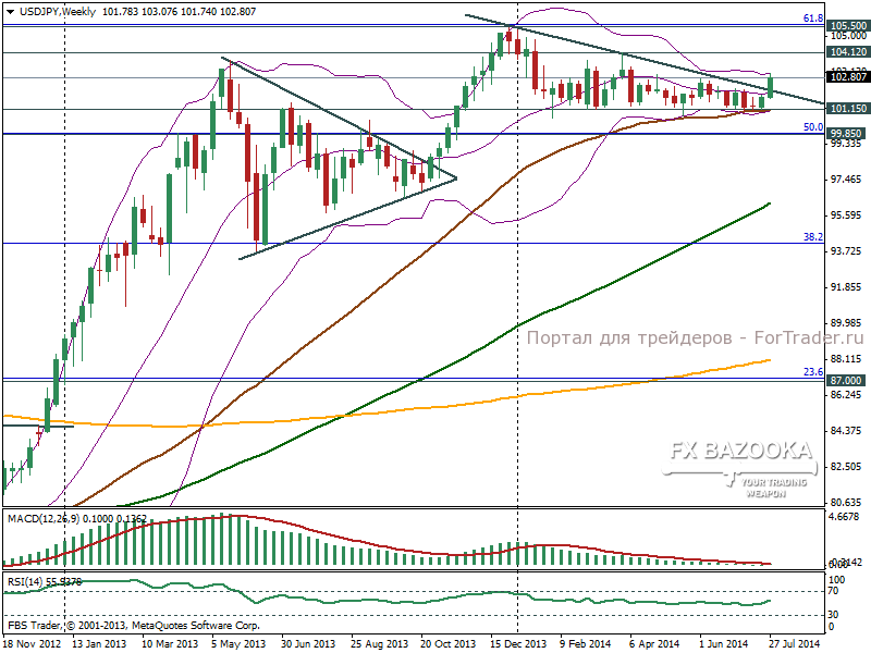 Пара USD/JPY установила новый максимум с начала апреля над 103.00 и достигла верхней недельной полосы Боллинджера. Американский доллар получил поддержку у 55-недельной скользящей средней, расположено чуть выше 101.00. Быкам открылся путь наверх. Сопротивление находится на 103.73 (максимум мая 2013 г.), 104.12 (максимум апреля 2014 г.) и 105.44 (максимум 2013 г.). Поддержка располагается на 101.15/00, 100.75/60 и 100.00/99.90.