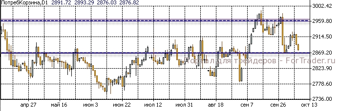 Рассматривая динамику потребительской корзины в биржевых ценах, которые, как правило, опережают официальный уровень инфляции, видно, что за сентябрь индекс Потребительская Корзина двигался в диапазоне 2870-2960 и на 1 октября 2011 года составил 2881 рублей за корзину.