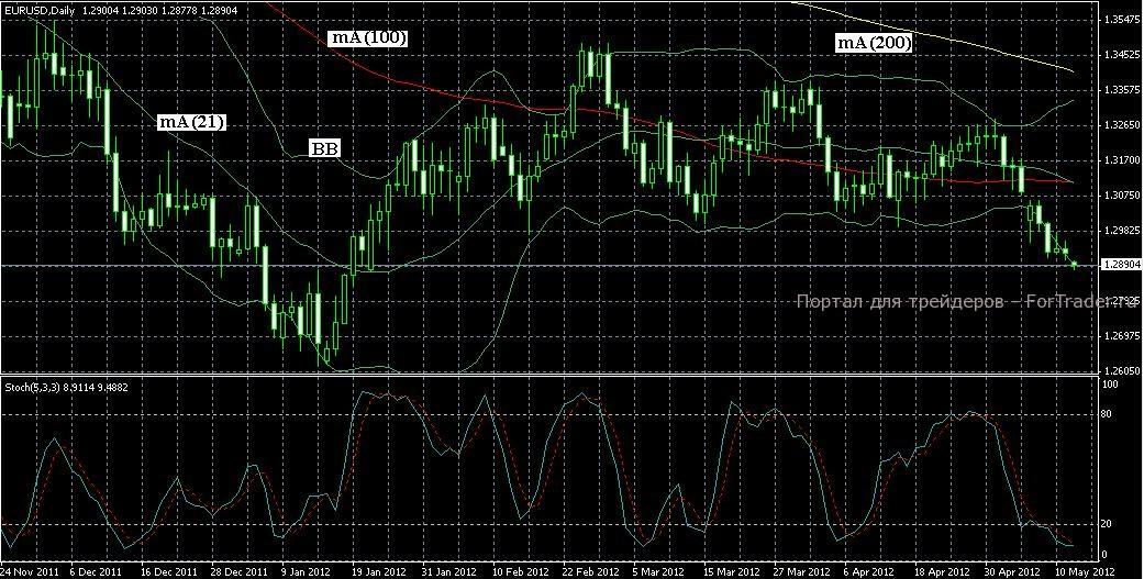 Из рисунка видимо, что кривая скользящая средняя mA(200) падает, сигнализируя в долгосрочной перспективе в пользу медведей. А mA(100) сигнализирует о медвежьих предпочтениях на более краткосрочную перспективу. Осциллятор Sstoch дает сигнал на продажу. Поэтому лучше быть в шортах. Также видно, что были протестированы уровни поддержки 1.2920 и 1.2880, которые являлись ближайшими целями медведей на отметках Фибо-коррекции.