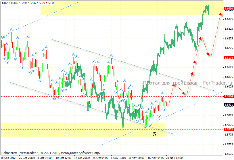 Анализ четырехчасового графика также указывает на потенциал роста в область 1.6430. На текущий момент котировки пары GBP/USD тестируют уровень сопротивления 1.5975. С пробитием сопротивления стоит ожидать начала роста пары. Следующим серьезным сопротивлением выступает область 1.6175. Отменой варианта станет падение котировок пары ниже 1.5800.