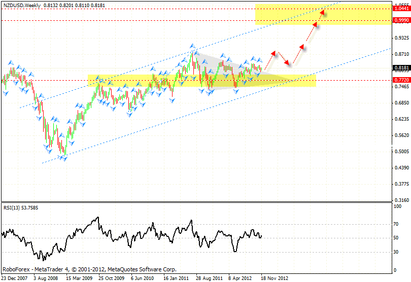 Новозеландский доллар продолжает движение в рамках восходящего тренда. В целом стоит ожидать продолжения существующей тенденции. На недельном графике пары формируется восходящая симметричная модель с целью отработки в области 1.0440. Серьезным уровнем поддержки выступает уровень 0.7720. Значения Индекса относительной силы на текущий момент находится выше уровня 50, что также говорит о наличии восходящей тенденции на рынке. Здесь же пробита вверх модель «Треугольник». Общей целью отработки модели выступает область 0.9990. Отменой варианта развития восходящего тренда станет падение котировок новозеландца и выход цены за пределы нижней границы модели.