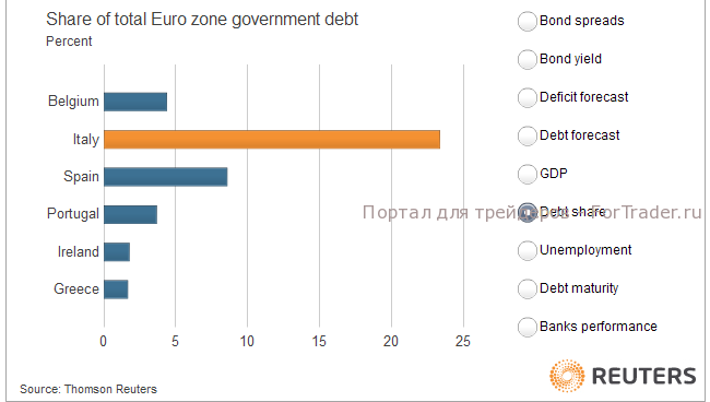 В случае выхода Греции из зоны евро, следующая в списке – Италия. Доходности облигаций, которые и в настоящий момент находятся у рекордных уровней (даже с учетом помощи от Европейского центрального банка), взлетят еще выше. Обслуживание долгов ляжет непосильным грузом на бюджет страны. Кстати, уже сегодня мы сможем увидеть атаку на суверенные бумаги Италии — на новости о понижении международным рейтинговым агентством Standard & Poor’s кредитного рейтинга страны на одну ступень — с «A+» до «А» с «негативным» прогнозом. Однако исключить Италию будет уже не так просто — ее доля в ВВП Евросоюза – 12,6% (Греции – чуть более 2%), а доля долгов – почти четверть. Тяжелейший кризис в стране отразится на всех без исключения государствах Европы.