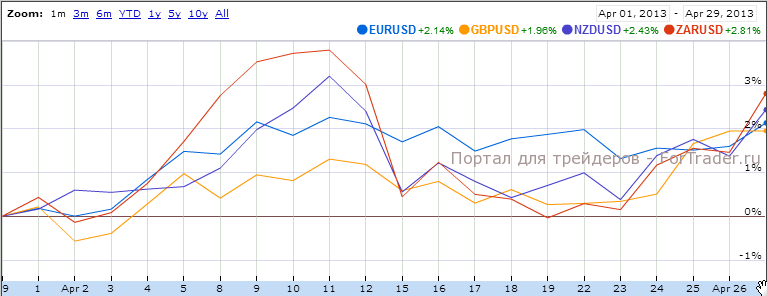 Валюта Великобритании в апреле выросла почти на 2%. Это во многом объясняется рыночной коррекцией – реакцией рынка на значительное падение фунта в первом квартале 2013. Период значительного снижения сменяется ростом и наоборот. Британская валюта находится в выгодном Центробанку коридоре и ее движения внутри этого коридора во многом определяются действиями спекулянтов. В данный момент рынок находится в восходящем тренде, предпосылок для завершения которого сейчас нет.