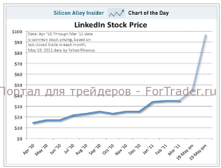 Чтобы оценить возможную цену размещения Facebook, посмотрим на результаты IPO компаний-аналогов. 19 мая 2011 года компания LinkedIn первой из американских соцсетей провела первичное публичное размещение. На приведенном ниже графике можно видеть стоимость акций до (по данным сделок между частными лицами) и после IPO. Рост более 105% был зафиксирован на Нью-Йоркской фондовой бирже (NYSE). Рыночная стоимость компании достигла в июне 9 миллиардов долларов по сравнению с 2 миллиардами до «публичного взрыва».