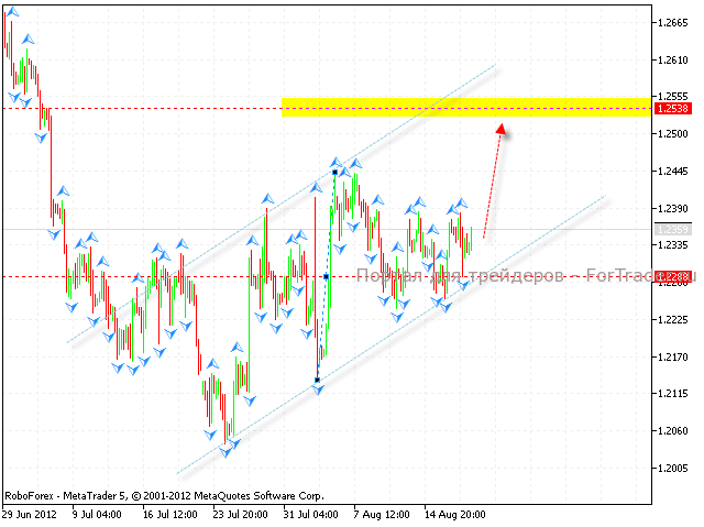На четырехчасовом графике пара евро/доллар продолжает движение в рамках восходящей модели. Целью отработки выступает область 1.2535. Можно рассматривать покупки евро с текущих уровней. Отменой варианта станет падение котировок пары ниже 1.2230. Наращивать объем длинных позиций рекомендуется с пробитием уровня 1.24. Таким образом, на текущей неделе стоит ожидать восходящего тренда на паре EUR/USD.