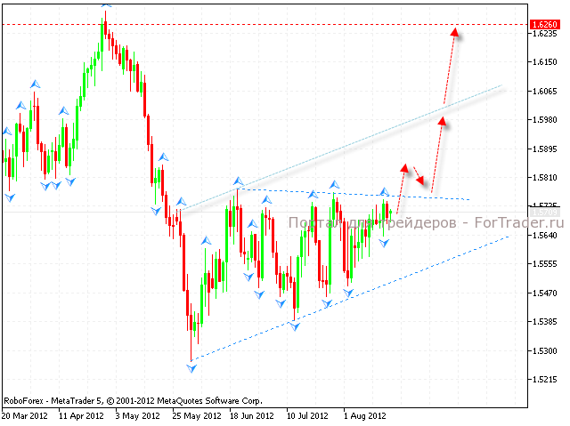 Валютная пара фунт/доллар движется в рамках модели «Треугольник». На текущий момент котировки пары вплотную приблизились к верхней границе модели. Можно рассматривать агрессивные покупки пары и ориентироваться на пробитие модели вверх. Консервативным трейдерам рекомендуется выждать пробития верхней границ и только потом рассматривать покупки пары. Общей целью отработки выступает область 1.6260. Ближайшим уровнем сопротивления выступает верхняя граница восходящего канала.