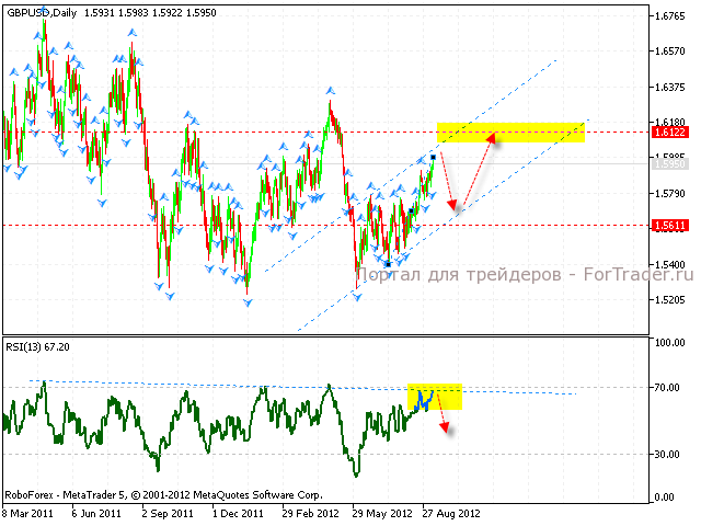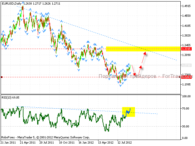 Валютная пара евро/доллар продолжает движение в рамках ожиданий. Котировки пары достигли обозначенного ранее уровня 1.2705. На текущий момент есть риск начала коррекции пары. В целом, исходя из анализа значений Индекса относительной силы, стоит ожидать рост котировок евро в область 1.3315. На значениях Индекса пробита линия нисходящего тренда, поэтому стоит ожидать тест аналогичной линии на графике цены. Однако в случае формирования разворотных сигналов на мелких временных промежутках стоит ожидать незамедлительную коррекцию пары евро/доллар.