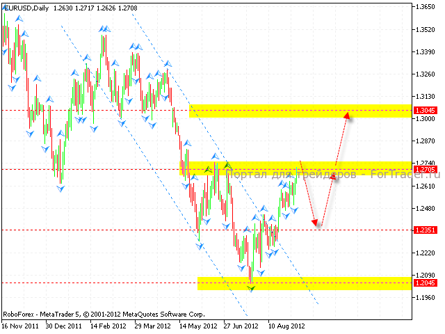 При более детальном рассмотрении дневного графика пары, котировки тестирую уровень сопротивления, тест которого также указывает на риск начала коррекции. Здесь есть потенциал для формирования разворотной модели «Голова и плечи». В таком случае стоит ожидать падения котировок пары в область 1.2350, откуда можно будет рассматривать покупки евро и ожидать начала полноценного разворота тренда. Общей целью отработки модели «Голова и плечи» может стать область 1.34.