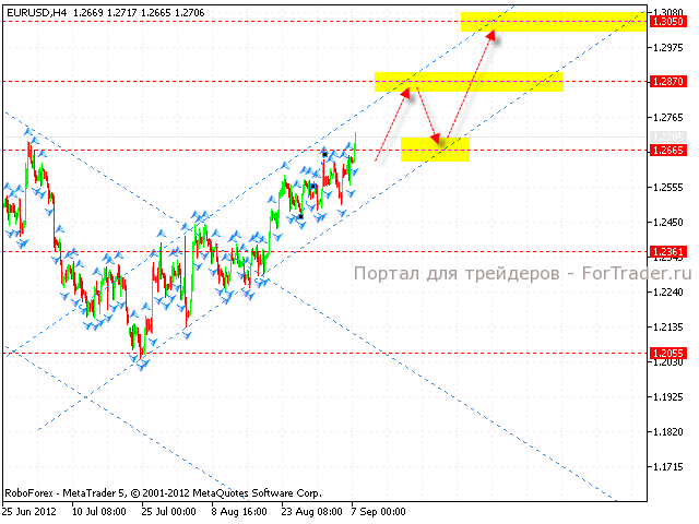 На четырехчасовом графике пары, предположительно, формируется восходящая модель. Ближайшей целью роста пары выступает область 1.2870. Далее стоит ожидать коррекцию евро к уровню поддержки 1.2705. Откуда вновь можно пробовать занимать длинные позиции по паре. Общей целью роста выступает область 1.3050. Однако стоит учитывать ситуацию на старших временных промежутка, и в случае пробития нижней границы канала, ожидать падения котировок к уровню 1.2350 и ожидать формирования модели «Голова и плечи». Таким образом, текущая неделя может стать разворотной для пары евро доллар, необходимо четко отслеживать сигналы перелома тренда на мелких временных промежутках.