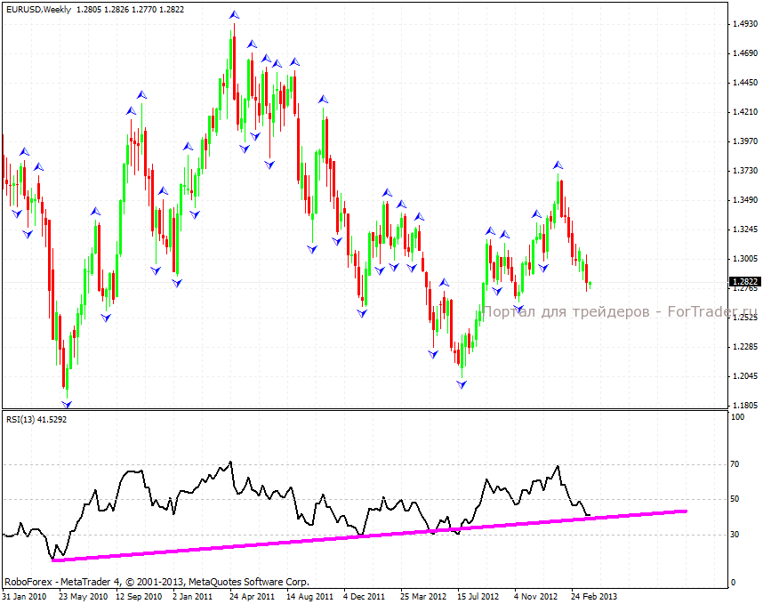 Валютная пара евро/доллар продолжает движение в рамках нисходящего тренда. Однако на недельном графике пары значения Индекса относительной силы встретили поддержку в виде восходящей линии тренда. Стоит ожидать начало коррекции вверх.