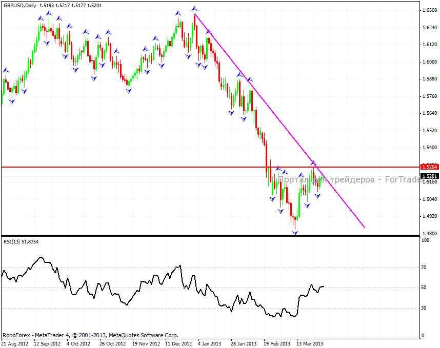 На дневном графике пары фунт\доллар котировки также тестируют нисходящую линию тренда. Стоит ожидать отскок и продолжения падения фунта. В области 1.5265 проходит сильный уровень сопротивления на недельном графике, что также оказывает поддержку американской валюте.