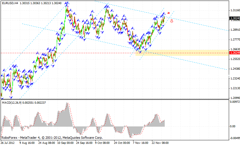 На четырехчасовом графике полностью выполнены цели по восходящей симметричной модели. Здесь же есть разворотные сигналы в виде дивергенции на MACD. С выходом цены за пределы нижней границы восходящего канала можно рассматривать открытие коротких позиций с близким стопом.