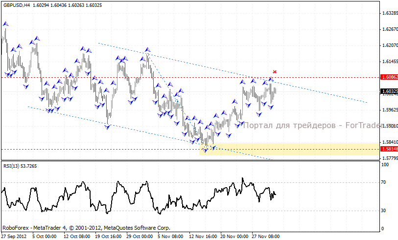 Валютная пара фунт/доллар находится в схожей с евро ситуации. На четырехчасовом графике пары формируется нисходящая симметричная модель. Общей целью падения выступает область 1.5815. Котировки пары находятся вблизи верхней границы нисходящего канала. Стоит ожидать начала падения фунта с текущих уровней. Дополнительным сигналом в пользу снижения выступает тест нисходящей линии тренда на Индексе относительной силы. Отменой варианта падения станет рост котировок пары фунт/доллар выше 1.6085.