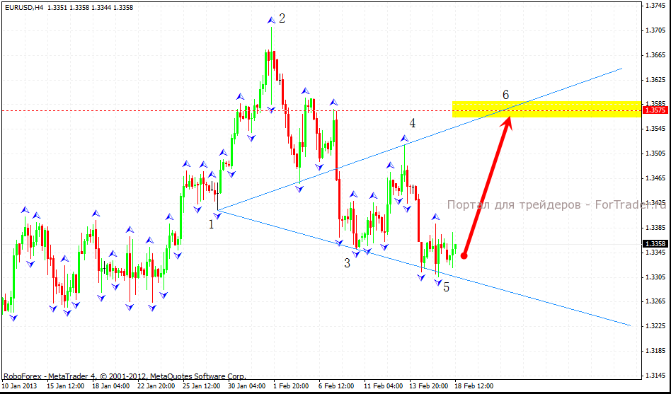 Валютная пара евро/доллар продолжает движение в рамках восходящей модели. На прошлой недели пара продолжила развитие коррекции. На четырехчасовом графике формируется восходящая модель Вульфа с целью в области 1.3575. Котировки пары находятся в области для покупок. Отменой варианта станет падение пары ниже 1.3300. В таком случае стоит ожидать начала развития нисходящего движения. Наращивать объем покупок рекомендуется с пробитием уровня 1.3385.
