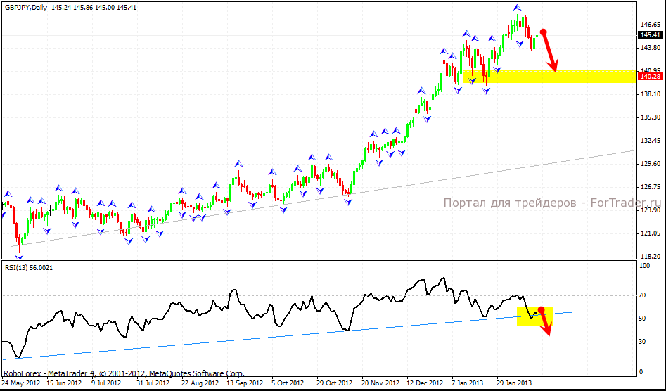 Валютная пара фунт/иена продолжает движения в рамках восходящего тренда. На текущий момент есть первые признаки разворота тенденции. Значения Индекса относительной силы протестировали линию восходящего тренда. В ближайшее время стоит ожидать пробития этой линии и соответственно падения котировок пары в область 130. Ближайшей целью снижения выступает область 140.30. На это указывает формирование модели «Неудавшийся размах». Отменой варианта станет рост котировок пары выше 147.50.