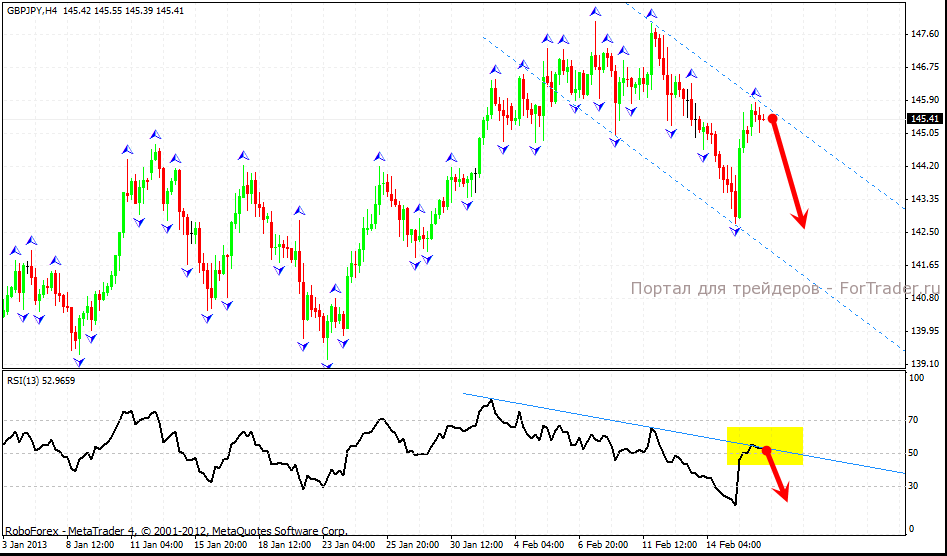 Анализ четырехчасового графика также указывает на развитие падения. Пара движется в рамках нисходящего тренда. Значения Индекса относительной силы тестируют нисходящую линию тренда, стоит ожидать отскок и падения котировок в область 142.50. Можно рассматривать продажи с близкими стопами. Отменой варианта станет рост пары за пределы нисходящего канала.