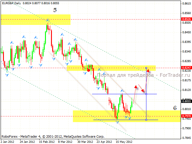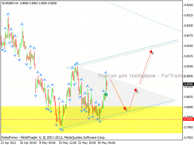 В качестве альтернативного варианта стоит рассматривать формирование модели «Треугольник». При такой развитии событий стоит ожидать тест уровня 0.7990, откуда можно рассматривать покупки EUR\GBP с близким стопом. Целью отработки модели выступает область 0.8140. В случае пробития нижней границы стоит ожидать продолжения падения пары.
