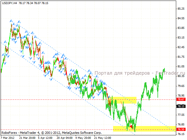 При анализе четырехчасового графика также есть потенциал к снижению USD\JPY. Ближайшей целью падения выступает область 76.50. Рассматривать продажи стоит вблизи уровня 78.70. Таким образом, в ближайшей перспективе стоит ожидать продолжения существующей тенденции на рынке, что в конечном итоге приведет к обновлению минимумов на паре USD\JPY.