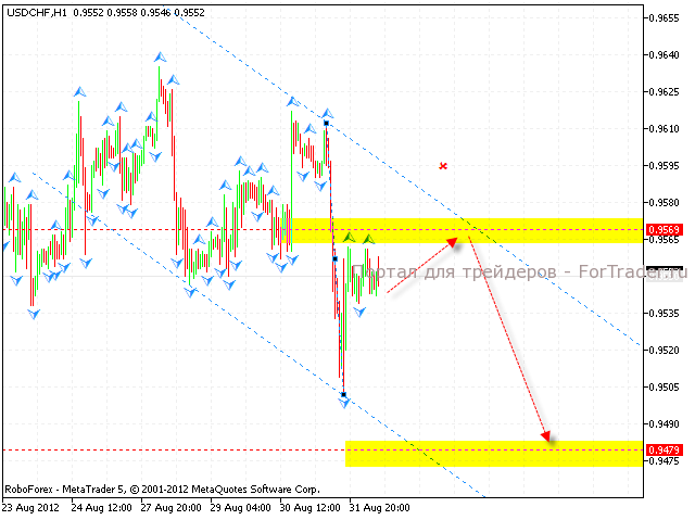 Валютная пара USD/CHF смогла покинуть пределы восходящего канала. Общей целью падения выступает область 0.9340. С текущих уровней стоит ожидать начала коррекции пары к верхней границе канала – 0.9650, откуда можно рассматривать продажи франка. Отменой варианта станет пробитие и выход цены за пределы нисходящего канала.