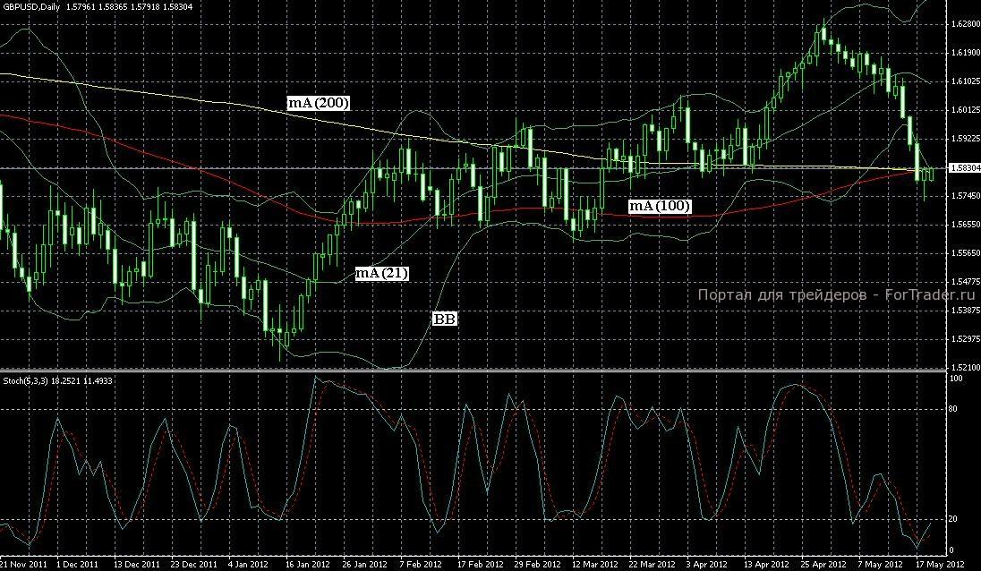 Из рисунка видимо, что кривая скользящая средняя mA(200) падает, сигнализируя в долгосрочной перспективе в пользу медведей. А mA(100) сигнализирует о медвежьих предпочтениях на более краткосрочную перспективу. Осциллятор Stoch дает сигнал на покупку. Поэтому лучше быть в шортах. Также видно, что были протестированы уровни поддержки 1.2720 и 1.2680, которые являлись ближайшими целями медведей на отметках Фибо-коррекции. Ближайшая бычья цель рынка – уровень 1.2930.