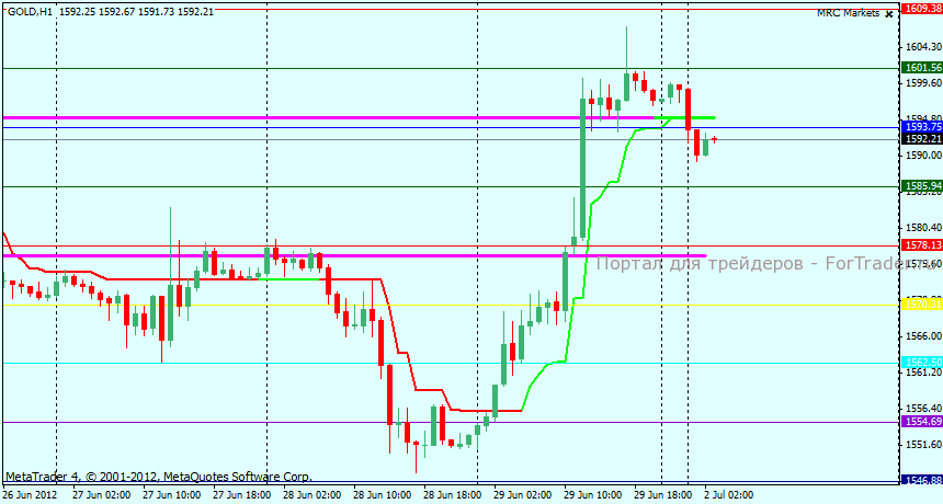 Часовой график GOLD находится в локальном восходящем движении, однако в настоящий момент рост цены остановился и наблюдаются попытки разворота в нисходящее коррекционное движение, признаком продолжения восходящего тренда будет являться уверенный пробой уровня предыдущего максимума 1609.
