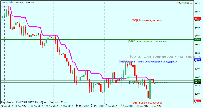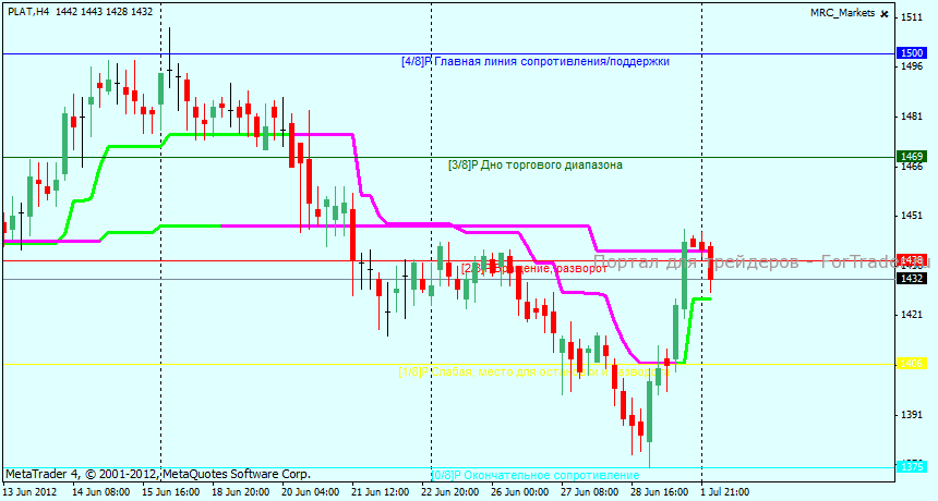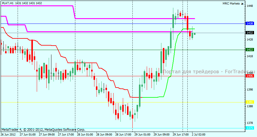 PLAT на H4 находится в боковом движении, уровнями поддержки и сопротивления можно назвать 1375 и 1500 соответственно, вероятность движения до обоих этих уровней в настоящий момент является одинаковой, какой-либо тренд в настоящий момент отсутствует, в ближайшее время вероятно продолжение бокового движения около текущих уровней.