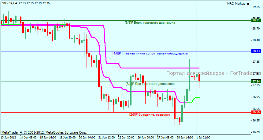 Часовой график SILVER находится в локальном боковом движении в рамках восходящего тренда, уровнем сопротивления является 27.73, в случае уверенного пробоя этого уровня можно будет говорить о продолжении восходящего тренда.