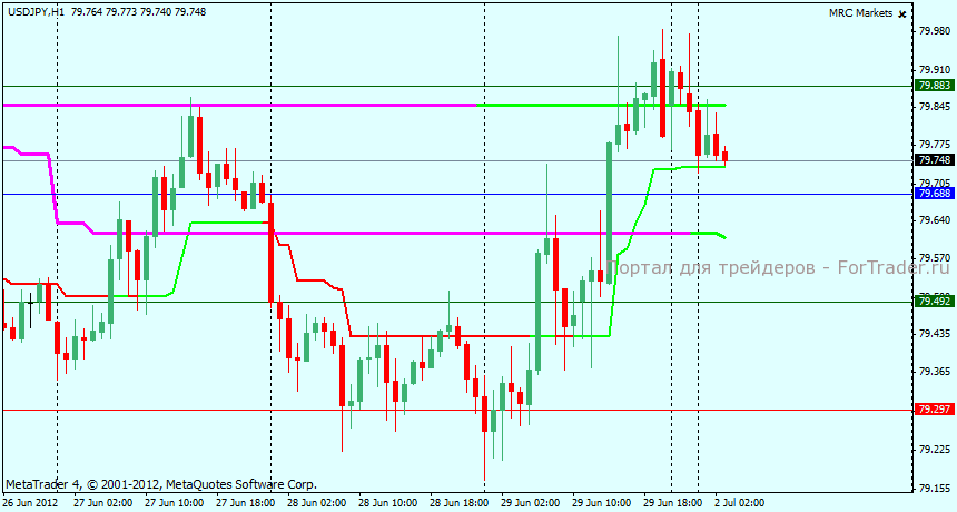 Часовой график пары USDJPY находится в локальном восходящем движении, рост пары остановился на уровне сопротивления 80.00, в случае пробоя этого уровня можно будет говорить о продолжении восходящего тренда.