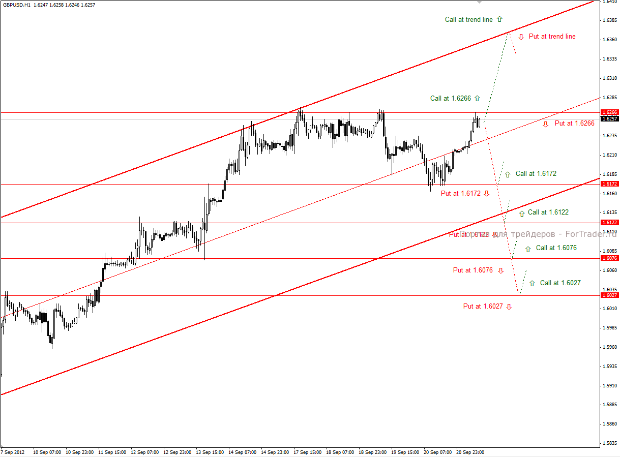 Если будут покупки от 1.6266 доллара за фунт (на данный момент это сопротивление), можно будет реализовать сделку с опционом Call. Если график цены не устоит сопротивление, можно ожидать продажи до 1.6172 и 1.6122 доллара за фунт и ниже.