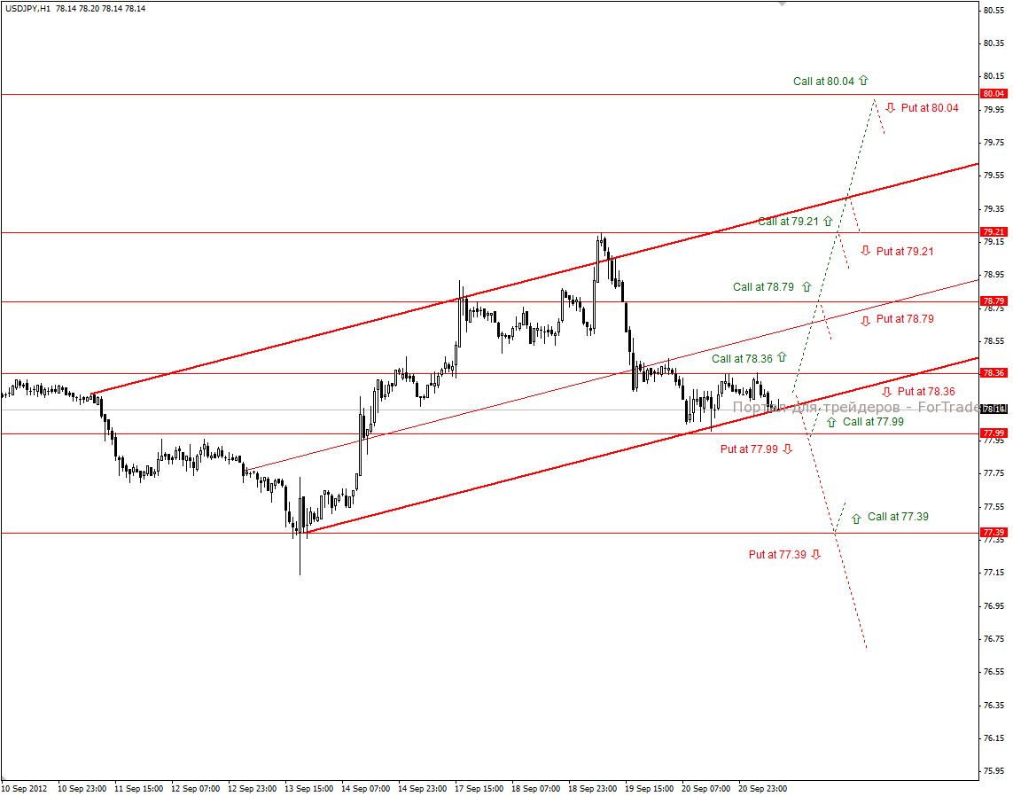 Часовой график валютной пары USD/JPY сформировал широкий диапазон 79.21 – 77.39 иен, кроме того видна попытка пойти против восходящей тенденции от 13 сентября. На следующей неделе будут актуальными поддержки на уровне 77.99 и 77.39 иен — на данный момент, данные ценовые уровни служат ключевыми значениями. При покупках, вполне вероятно ориентироваться на сделки с опционами Саll, до такого значения как 79.21 иен. В случае продаж ориентиром для сделок Put послужат такие уровни как 77.99 и 77.39 иен.