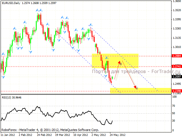 Валютная пара EURUSD вопреки ожиданиям продолжила снижение. На текущий момент на дневном графике пары формируется нисходящая симметричная модель. Целью отработки выступает область 1.24. Текущая структура движения цены подразумевает коррекцию евро в область 1.2880-1.2740, откуда стоит искать возможности для продаж пары. Отменой варианта станет пробитие верхней границы нисходящего канала.