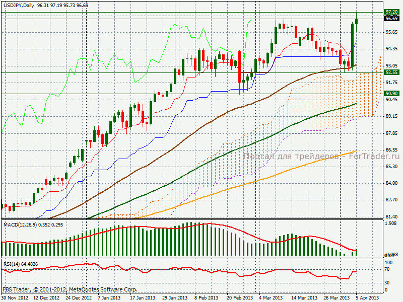 В четверг пара USD/JPY совершила мощный рывок на 370 пипсов и закрылась чуть ниже мартовского максимума 96.70, a в пятницу протестировала новый максимум за 3.5 года на уровне в 97.20. Как видно из недельного графика, пара закрыла медвежий гэп, сформировавшийся на неделе 17 марта. Пара сильно перекуплена, на дневном графике образовалось еще одно расхождение по MACD, однако сейчас рынком движут преимущественно фундаментальные факторы.