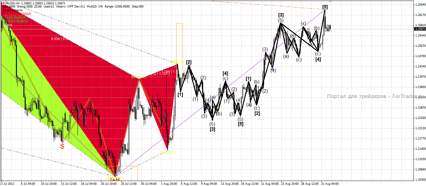 Разметка четырехчасового графика внушает уверенность по анализу на старших таймфреймах. У нас есть пяти волновая структура Эллиота. При пробитии 1.2540 цена пойдет к уровню 1.2490, далее 1.2434 и 1.2360. Альтернативным вариантом будет формирование растянутой плоскости, при пробитии 1.2635 целью на buy будет отметка 1.2720.