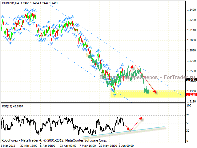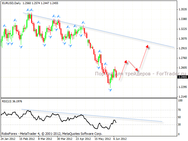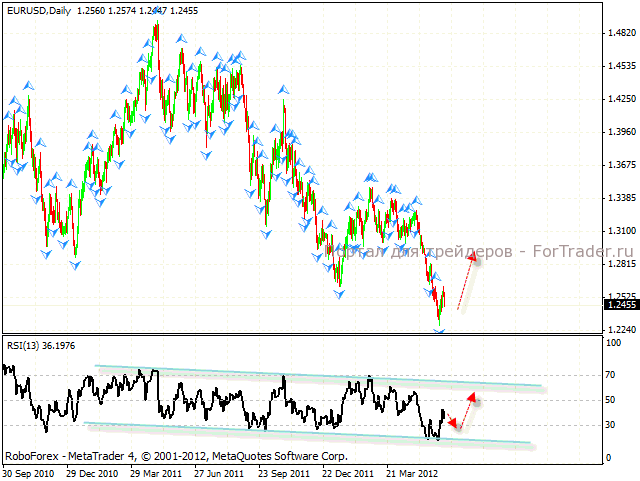 При ближайшем рассмотрении дневном графика, также есть вариант роста пары. С пробитием нисходящей линии тренда на Индексе относительной силы, ближайшей целью роста станет аналогичная линия на графике цены. Целевая область – 1.2915. Перед пробитием линии тренда котировки пары eur/usd могут вырасти в область 1.2760, где уже с большой вероятностью можно будет говорить о начале коррекции евро.