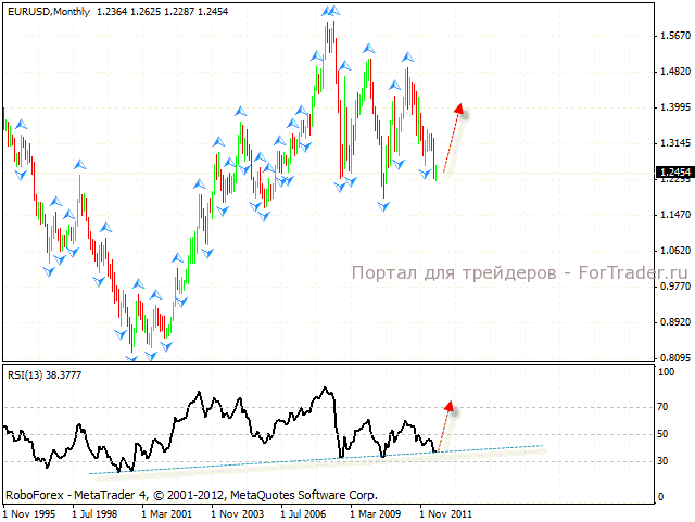 Технический анализ месячного графика пары – это прогноз на долгосрочную перспективу, здесь также стоит ожидать отскок вверх. Как видим, значения Индекса относительной силы в очередной раз тестирую восходящую линию тренда.