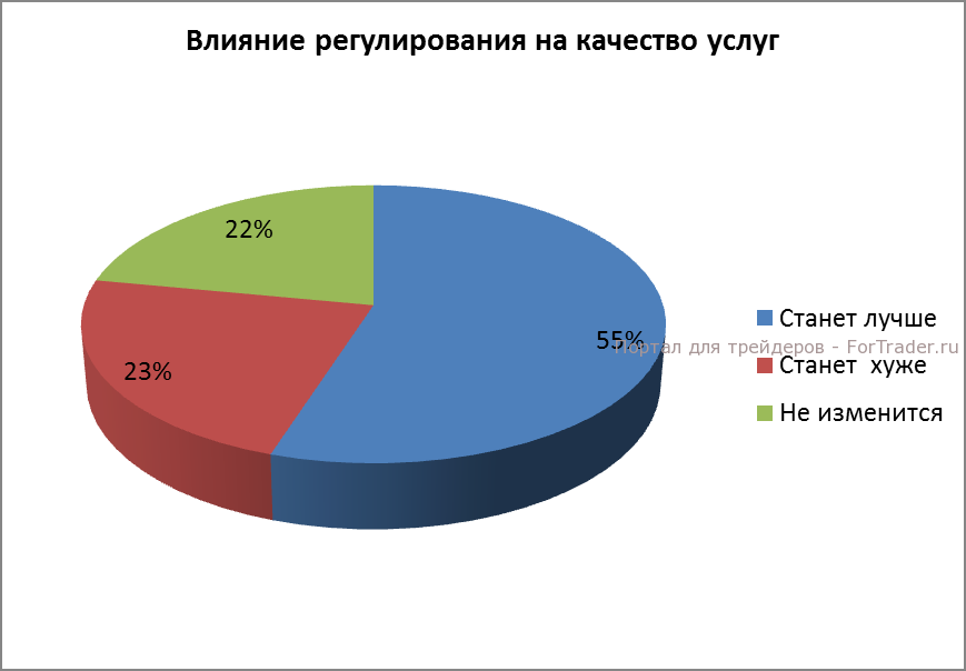 23% опрошенных считает, что введение регулирования приведет к снижению качества форекс-услуг, в то время как более половины участников опроса (55%) ожидают, что качество форекс-услуг улучшится.