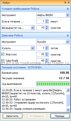 Теперь наряду с ручным размещением ордеров трейдеры получили возможность самостоятельно настраивать параметры и запускать алгоритм (торговую стратегию Робота) с целью автоматического (без вмешательства трейдера) размещения рыночного ордера на куплю/продажу финансового инструмента в зависимости от изменения цены этого или другого инструмента.