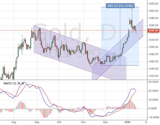 Gold price growth has amounted to 11% of $161 for 1.5 months that provided continuation of the uptrend, which began much earlier in the markets. Interest in this precious metal is constantly growing against the political instability in the world. If the price continues growth after the current rollback and breaks $1600, we can see further movement to $1800 per ounce of gold.