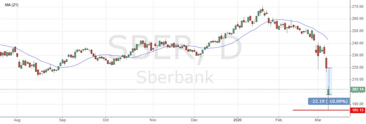 Рынок продолжал падать вплоть до 185, пока не включился ЦБ РФ, который предложил миноритарием возможность выкупа акций Сбербанка «без выставления оферты», что сразу изменило положение. Сейчас котировки SBER возвращают часть потерянных позиций и торгуются на отметке 202 рубля.