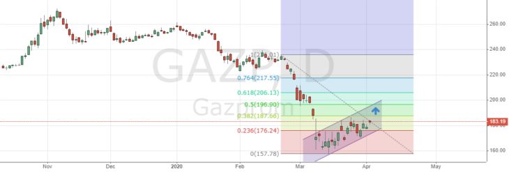 Акции Газпрома очень активно восстанавливают свои позиции, не смотря на плачевное положение на рынке нефти. Пока акции российского гиганта стабильны и не реагируют на новостной поток, потому что себестоимость готового продукта вполне конкурентоспособна, и доля государственного участия в предприятии поддерживает уверенность в инвесторах. Сейчас акции Газпрома торгуются возле сопротивления 188 рублей. Прорыв его вверх даст возможность начать закрывать падение марта и нас ждет цена в районе 197 рублей за акцию.