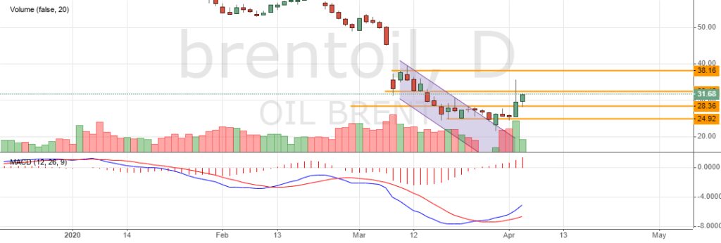 Нисходящий тренд на рынке нефти явно пробит. Быки дождались своего отскока после мощных минимумов, усложнивших жизнь мировой экономике. Сейчас идет этап коррекции, который инициирован текущими лидерами отрасли — Россией, Саудовской Аравией и США. Трамп сажает ОПЕК+ за стол переговоров, видя, что внутренняя экономика нужных стран уже подорвана, можно начинать лоббировать свои интересы.