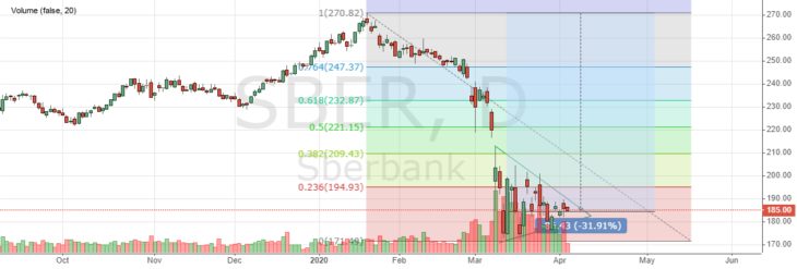 Вероятно, последует сокращение дивидендной политики банка, что окажет влияние на курс акций SBER. Пока котировки находятся на отметке 184 рубля и сужаются в треугольнике в ожидании мощной новости.