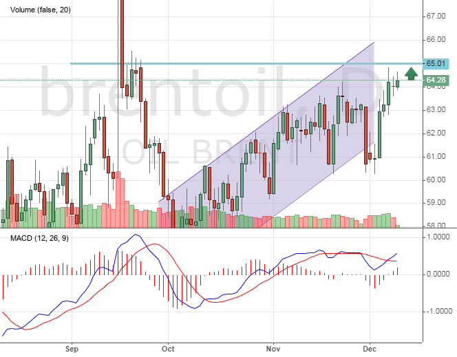 Цена на нефть продолжает оставаться в рамках восходящего тренда, не смотря на разногласия в странах ОПЕК и сложности с продлением договора. Цены уже почти достигли сентябрьских уровней, отыграв сильное снижение. Ближайшая цель роста на сегодня — отметка 65$ за баррель.