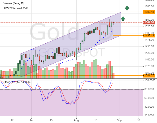 Цена на золото продолжает расти, интерес вызывают инвестиции в него как в защитный актив. Следующим знаменательным шагом должно стать преодоление отметки 1580$ за унцию, после которого возможен рост до 1800$. Коррекция возможна в район 1490$ и 1350$.