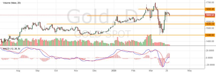 Цена на золото после резкого роста на прошлой неделе продолжает корректироваться на текущей. Отскок сразу на 200 долларов вверх не мог не спровоцировать откат, который мы продолжаем наблюдать. Сдерживает курс мировой карантин, который остановил работу многих профильных предприятий и мероприятий, способных поднять спрос на металл.