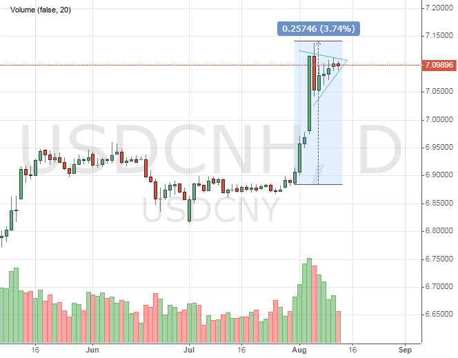 Курс юаня продолжает оставаться на самом низком уровне за довольно продолжительный период. Война США и Китая обостряется, и власти Поднебесной делают все, чтобы защититься от действий президента Трампа. Пока цены сущаются в Треугольник, пробой которого будет зависеть от следующего шага сторон.